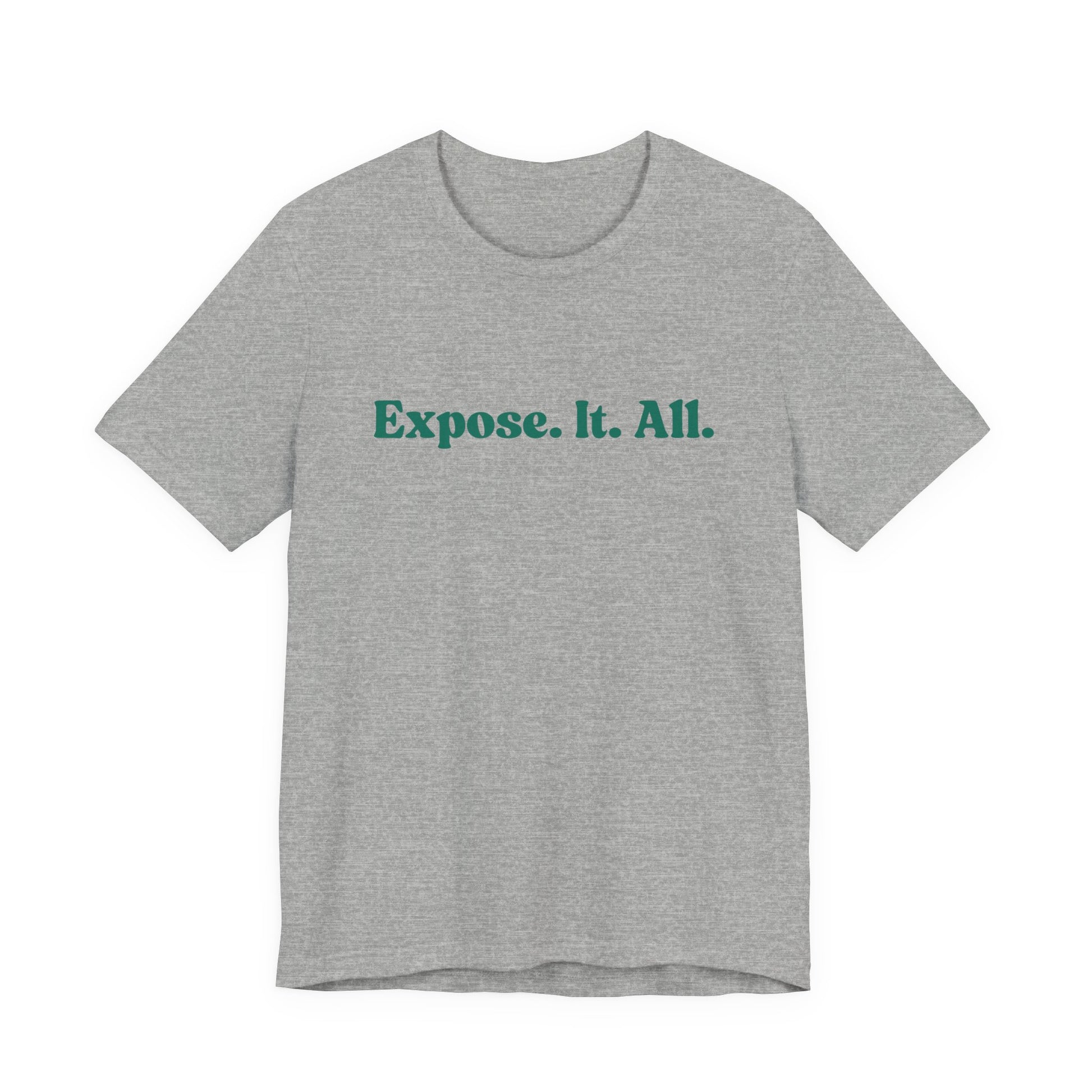 Clean, confident, and quietly bold — this lightweight jersey tee features a simple, statement-front print that reads “Expose. It. All.” in a muted forest tone. The breathable Airlume combed and ring-spun cotton feels soft against the skin and layers easily under jackets or on its own for days when clarity matters. Subtle tailoring from side seams and a ribbed knit collar keeps the shirt looking sharp after repeated wear. The understated design speaks to someone who values honesty, transparency, and thoughtful conversation — a wearable prompt to speak up and cut through noise. Wear it to community meetups, art shows, or casual mornings out where real talk starts over coffee.